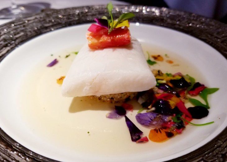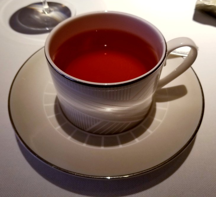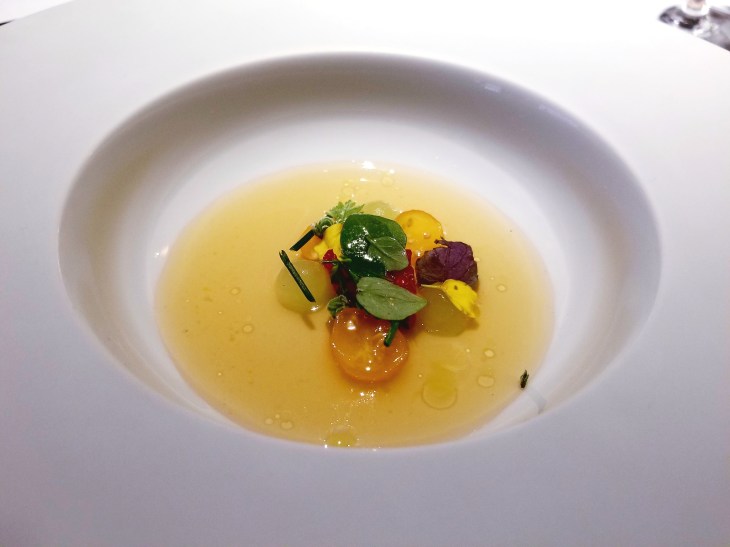 The first course was a refreshing, cold tomberry tomato soup with a clear broth. The flavorful herbs were a reminder of summer about to pass – a delicious start to a memorable meal.