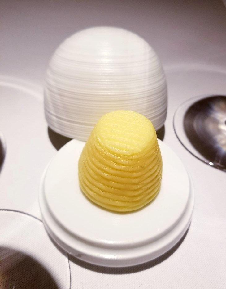 We were welcomed with a glass of Gonet-Medeville rosé champagne, a combination of chardonnay and pinot noir varietals, with a small portion of red wine from Ambonnay. Bread came around to each table; the salted butter was a nice touch.