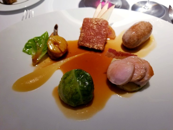 Then came the mains: suckling pig for me and Herdwick lamb for Travis. I enjoyed a glass of New Zealand Syrah with my pork platter; Travis sipped a glass of Chateau L’Evangile pomerol with his lamb plate.