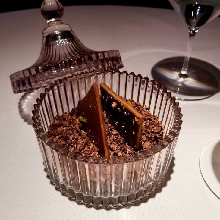 Balls of white chocolate were served in a dry ice encasement, along with herbal infused jellies and pistachio caramel chocolate “toffee.”