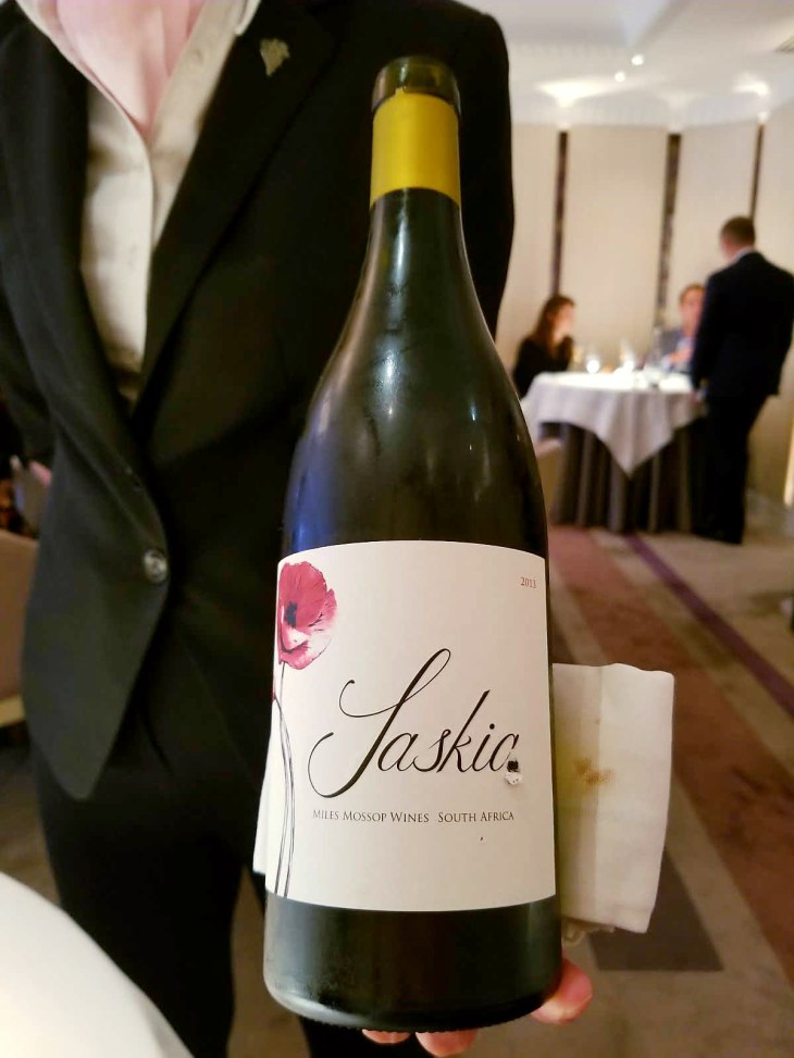 A fourth course of Isle of Gigha halibut in a ras el hanout infused broth was delivered next, paired with a glass of South African Saskia. Atop the halibut was a piece of Atlantic king crab. The hot broth was served still swirling in a glass pourer, a flourish of herbs to catch the eye. The edible flowers were a nice touch.